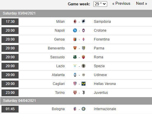 Những CLB đang cạnh tranh top 4 hay nhóm dự Europa League như Atalanta, Napoli, AS Roma hay Lazio vòng này đều gặp các đối thủ dưới cơ. Ngoại trừ AS Roma phải chơi trên sân khách thì những đội còn lại đều có ưu thế sân nhà và được kỳ vọng sẽ giành chiến thắng. Nhìn chung là trật tự BXH sau vòng 29 khả năng cao sẽ không có thay đổi.
