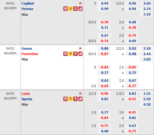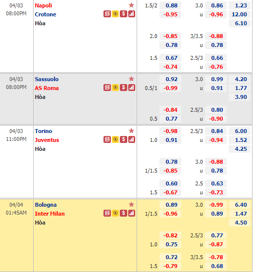 Trong khi đó, đội đang dẫn đầu giải Inter sẽ có chuyến làm khách đến sân của Bologna ở trận cầu muộn nhất vòng đấu. Bologna đang ở khu vực giữa BXH và có cách biệt an toàn với nhóm cầm đèn đỏ, vậy nên khó đòi hỏi sự quyết tâm cao độ từ phía chủ nhà. Tỷ lệ chấp 1 1/4 dành cho Inter Milan trận này là bước nhảy vọt, bởi lần gần nhất ghé thăm sân của Bologna, Inter chỉ chấp có 1/2.
