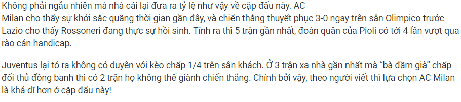 Juventus lại tỏ ra không có duyên với kèo chấp 1/4 trên sân khách. Ở 3 trận xa nhà gần nhất mà “bà đầm già” chấp đối thủ đồng banh thì có 2 trận họ không thể giành chiến thắng. Chính bởi vậy, theo người viết thì lựa chọn AC Milan là khả dĩ hơn ở cặp đấu này!".