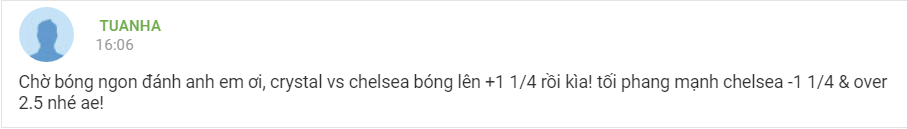 AEGOALer TUANHA cho rằng lựa chọn Chelsea càng sớm càng có lợi vì cán cân thị trường vẫn đang tiếp tục nghiêng về phía The Blues vào chiều 7/7. "Crystal Palace vs Chelsea bóng lên +1 1/4 rồi kìa! Tối phang mạnh Chelsea -1 1/4 và Over 2.5 nhé anh em!".
