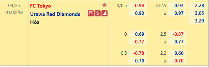 Hành quân tới sân của FC Tokyo cuối tuần này, Urawa Reds dù đang chơi rất ấn tượng nhưng vẫn bị đánh giá ở cửa dưới với mức kèo châu Á đội chủ nhà chấp 0:1/4. Đây cũng là tỷ lệ xuất hiện ở trận lượt đi khi FC Tokyo phải làm khách tới sân Urawa Reds, cho thấy sự thất thế của đội bóng thủ đô.