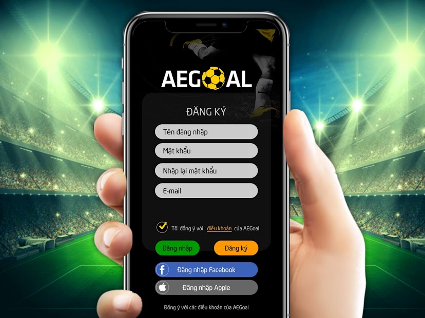Giao diện đăng ký thành viên AEGOAL sau khi cài đặt - thành viên có thể chọn nút Đăng nhập Facebook bên dưới để tham gia nhanh nhất