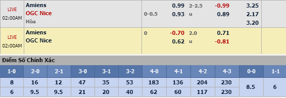 Tổng bàn thắng cả trận: Tình thế đã rất khác so với mùa giải năm ngoái. Nice đang sa sút và trở về đúng hình ảnh vốn có của họ với một đội bóng trung bình tại Ligue 1. Trong khi đó, Amiens chưa ghi được bàn thắng nào từ đầu mùa. Do đó rất khó để hy vọng vào kịch bản tưng bừng bàn thắng. Chọn Dưới 2 1/4 bàn cả trận.