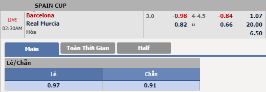 Tổng bàn thắng cả trận: Bị dẫn 3 bàn từ trận lượt đi, Murica nhiều khả năng sẽ chơi cởi mở với đội hình dâng cao nhằm hy vọng tạo ra bất ngờ. Thực tế, việc chơi phóng khoáng hơn là điều cần thiết bởi Murcia còn quá ít lý do để tính toán. Trong khi đó, Barcelona nhiều cầu thủ trẻ từ đội hình B sẽ khó tránh khỏi những chệch choạc. Thực tế, có tới 4/5 trận đối đầu gần nhất giữa hai đội đều khép lại với ít nhất 3 bàn thắng. Chọn Trên 4 1/4 bàn cả trận.