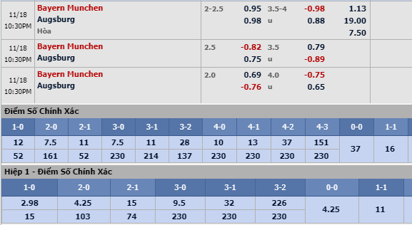 Trên sàn giao dịch hiện nay với mức Bayern Munich chấp 2 1/4 không phải là tỷ lệ cao nếu nhìn vào các trận sân nhà của họ từ đầu mùa bởi có tới 5/6 trận gần nhất tiếp đón các đối thủ đều chứng kiến Hùm xám chấp từ 2 bàn trở lên. Tuy nhiên, không có nhiều lý do để tin tưởng vào khả năng thắng cách biệt 3 bàn trở lên của Bayern Munich khi họ vừa thua kèo tới 3/5 trận gần nhất.