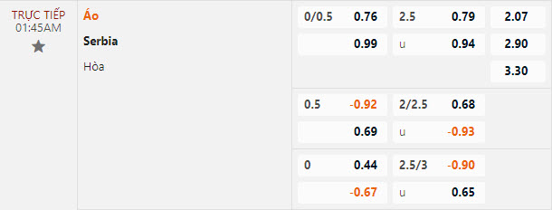 Sàn giao dịch châu Á ghi nhận mức kèo Áo chấp 1/4 trái, chứng kiến lần đầu tiên trong lịch sử họ "ngồi mâm trên" khi đối đầu Serbia, cho thấy các nhà đầu tư đang có niềm tin rất lớn vào đội chủ nhà. Đây là điều hoàn toàn dễ hiểu, bởi Áo đang sở hữu mạch 4 trận liên tiếp thắng kèo so với 4 trận thua kèo gần nhất của Serbia.