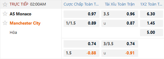 Giới chuyên gia đưa ra mức kèo chấp 1 1/4:0, tức Man City là cửa trên và Monaco được chấp +1 1/4. Đây là con số phản ánh đúng sự chênh lệch hiện tại giữa một ứng cử viên vô địch với một đội bóng vừa thua đậm ngay trận mở màn.