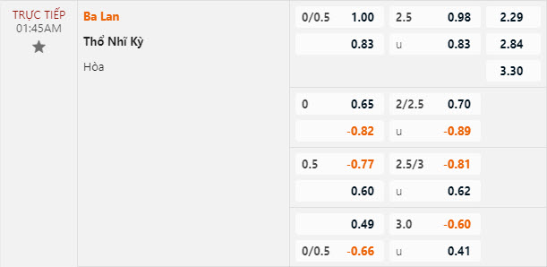 Tỷ lệ kèo Ba Lan vs Thổ Nhĩ Kỳ