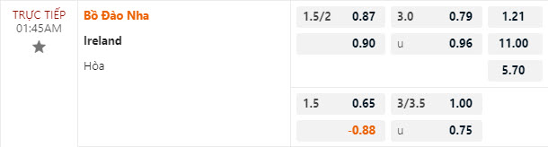 Tỷ lệ kèo Bồ Đào Nha vs CH Ailen
