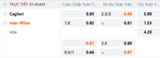 Tỷ lệ kèo Cagliari vs Inter Milan