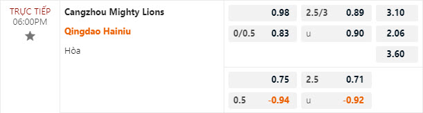 Tỷ lệ kèo Cangzhou Mighty Lions vs Qingdao Hainiu