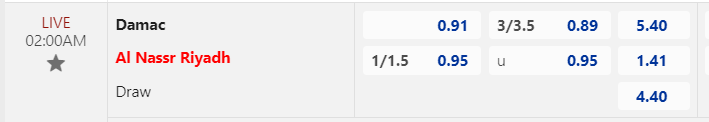 Thị trường châu Á ghi nhận kèo Al Nassr chấp 1 1/4 trận này. Nhìn sang tỷ lệ hiệp 1 khách chấp hòa cân tiền càng cho thấy cửa trên sáng giá. Tỷ lệ đó tương tự với kèo chấp mà Al Nassr từng sở hữu trong lần ghé thăm sân của Damac gần nhất, trận đó Al Nassr thắng đậm 3-0. Nếu như Damac thua theo châu Á ở 2 vòng mới đây thì Al Nassr toàn thắng và vượt kèo 3 trận vừa qua.