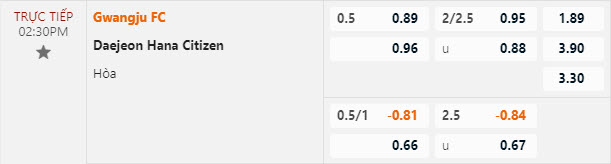 Tỷ lệ kèo Gwangju vs Daejeon Hana Citizen