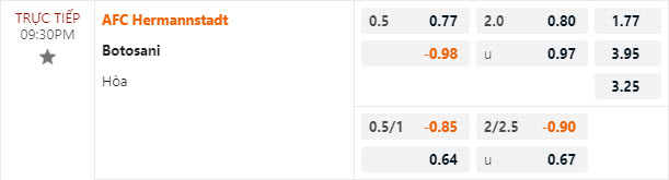 Với ưu thế sân nhà và lực lượng nhỉnh hơn, Hermannstadt chấp hòa trên sàn châu Á. Hermannstadt toàn thắng kèo 3 lần gần nhất chấp đội khách nửa trái thuộc giải VĐQG Romania. Trong khi đó, Botosani thua kèo 2/3 lần được đội chủ nhà chấp 0,5 trái kể từ khi giải VĐQG Romania 2023/24 khởi tranh. So với Hermannstadt thì Botosani khó mang tới nhiều niềm tin bằng.