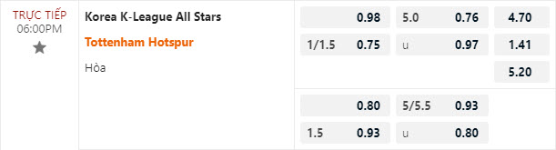 Tỷ lệ kèo Korea Republic Stars vs Tottenham