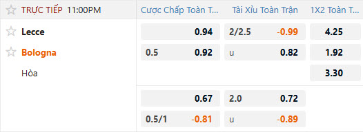 Theo giới chuyên gia, mức kèo châu Á của trận đấu được ấn định là 1/4:0, đồng nghĩa với việc Bologna chấp nhẹ -1/4 dù phải chơi trên sân khách. Sự sắp đặt này phản ánh chính xác tình hình hiện tại: Lecce đang ngụp lặn ở cuối bảng, thua cả 4 trận gần nhất, trong khi Bologna đã thắng 2 trận sau 4 vòng đầu tiên. Sự khác biệt về tinh thần và hiệu quả thi đấu khiến cán cân nghiêng về phía đội khách.