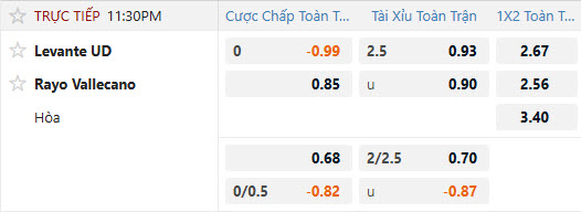 Tỷ lệ kèo Levante vs Rayo Vallecano