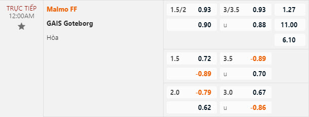 + Malmo thắng 4 trong 5 trận đối đầu gần nhất với GAIS theo kèo châu Á.