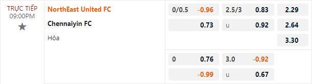 Tỷ lệ kèo NorthEast United vs Chennaiyin