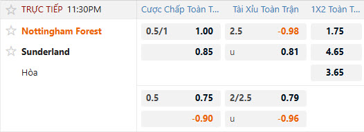 Tỷ lệ kèo Nottingham vs Sunderland