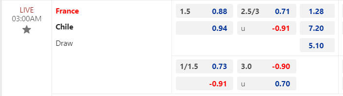 Nhà cái đưa ra tỷ lệ Pháp chấp 1 1/2 ăn ít cho trận này. Kèo châu Á như vậy cao hơn rất nhiều so với mức chấp hòa mà Pháp từng sở hữu trong lần đụng độ gần nhất với Chile. Trên sân nhà thì Pháp có 3 lần thắng kèo trong 4 cuộc tiếp khách mới đây. Còn về phía Chile, họ khiến các nhà đầu tư thất vọng toàn tập với 8 trận sân khách liên tiếp thua về phương diện châu Á.