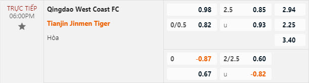 Tỷ lệ kèo Qingdao West Coast vs Tianjin Jinmen