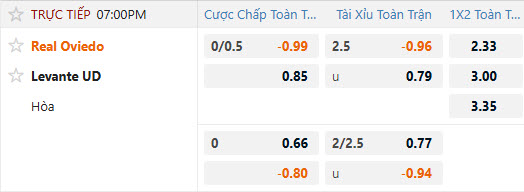 Real Oviedo thắng kèo lẫn tỷ số 3/4 lần tiếp đón Levante kể từ tháng 11/2016. Thành tích đối đầu ấn tượng này có lẽ đủ để Real Oviedo trở thành phương án mang tới nhiều niềm tin.