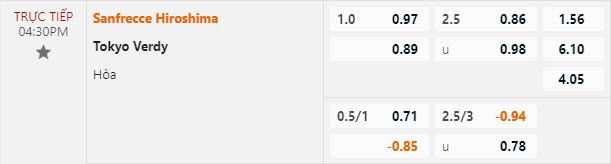 Tỷ lệ kèo Sanfrecce Hiroshima vs Tokyo Verdy