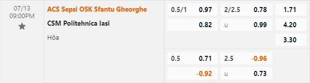 Tỷ lệ kèo Sepsi vs Politehnica Iasi