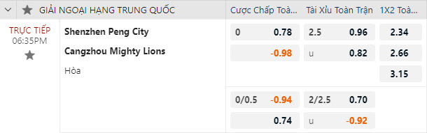 Tỷ lệ kèo Shenzhen Peng City vs Cangzhou Mighty Lions