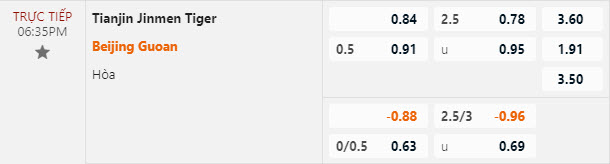 Tỷ lệ kèo Tianjin Jinmen Tiger vs Beijing Guoan