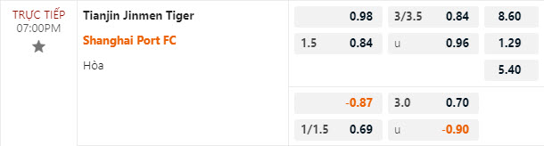 Tỷ lệ kèo Tianjin Tiger vs Shanghai Port