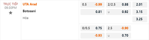 UTA Arad đang là đội bóng có tỷ lệ thắng kèo cao nhất giải VĐQG Romania với 21/32 trận thi đấu. Trên sân nhà, họ đã 11 lần giúp các nhà đầu tư châu Á ca khúc khải hoàn ra về trong tổng số 16 trận ra quân. Trong khi đó, Botosani đang chìm trong khủng hoảng khi thua kèo tới 10/16 trận rời xa tổ ấm. Với những con số thống kê này, nằm kèo chủ nhà với tỷ lệ chấp 1/2 trái vẫn sẽ là sự lựa chọn an toàn cho người chơi châu Á.