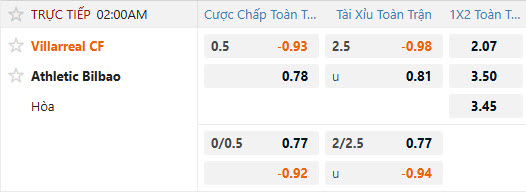 Tỷ lệ kèo Villarreal vs Athletic Bilbao