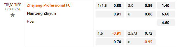 Tỷ lệ kèo Zhejiang vs Nantong Zhiyun
