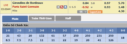 Để duy trì đà hưng phấn của mình, các cầu thủ PSG chắc chắc sẽ quyết tâm đánh bại nốt Bordeaux để hướng tới mục tiêu vượt qua mốc 100 điểm về cuối mùa. Đó là lý do dù đã vô địch sớm 5 vòng đấu nhưng PSG vẫn được ưu ái áp tỷ lệ chấp lên tới 1 1/4. Đáng chú ý, mùa này tỷ lệ thắng kèo sân nhà của Bordeaux chỉ là 37%, đứng thứ 14/20 đội. 13 trận gần nhất được chơi tại Matmut-Atlantique họ thua kèo tới 9 trận.