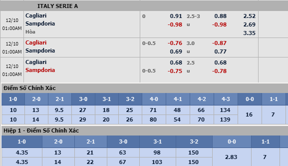 Tổng bàn thắng cả trận: Vấn đề của Cagliari nằm ở hàng thủ nhưng họ vẫn chưa có phương án nào khắc phục một cách triệt để. Tình trạng công làm thủ phá vẫn tiếp diễn qua từng vòng đấu khiến cho 8/10 trận gần nhất của đội chủ nhà đều khép lại với ít nhất 3 bàn thắng. Phía đối diện, Sampdoria luôn duy trì được thế chủ động trong trừng trận đấu của họ. 9/10 trận có sự góp mặt của đội khách đều kết thúc với ít nhất 3 bàn là minh chứng rõ ràng nhất. Chọn Trên 2 3/4 bàn cả trận.