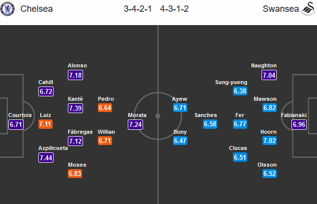 Chelsea FC: David Luiz (8/1 hậu vệ), Michy Batshuayi (7/2 tiền đạo), Charly Musonda (2/0 tiền vệ), Kenedy (0/0 tiền vệ)