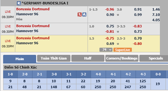 Tổng bàn thắng cả trận: Dortmund không còn cách nào khác là chiến thắng để nuôi hy vọng được dự Champions League và ít nhất lấy lại niềm tin cho nhà đầu tư. Phía đối diện, Hannover hoàn toàn có tâm lý thỏa mái khi họ không chịu sức ép đáng kể nào thực sự cấp bách về mặt thành tích. Chỉ số 3 hòa cho khả năng tưng bừng bàn thắng mà các nhà cái đang niêm yết cũng là điểm tựa đáng kể tin vào lựa chọn trên.