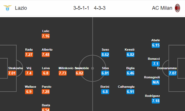 - Lazio thiếu vắng nhân tố quan trọng là Felipe Anderson do chấn thương còn AC Milan không có sự vắng mặt đáng tiếc nào