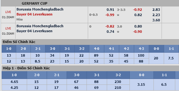 Tronng lịch sử Cúp QG Đức, Leverkusen chỉ 1 lần duy nhất giành chức vô địch vào năm 1993 với tổng cộng 3 lần lọt vào chung kết. Lần gần nhất Leverkusen tiến đến trận cuối cùng đã diễn ra từ năm 2009. Thành tích này thực sự khiêm tốn nếu nhìn vào bảng vàng của M'gladbach. Đội chủ nhà đã có 3 lần đăng quang trong tổng cộng 5 trận chung kết. Trong lần đụng độ gần nhất tại Cúp QG, M'gladbach đã giành chiến thắng sau loạt đấu penalty khi hai đội hòa 1-1 ở 120 phút thi đấu. Khi đó vào năm 2010 và trận đấu cũng diễn ra trên sân của M'gladbach với mức tỷ lệ Leverkusen chấp 1/4 giống như bây giờ.
