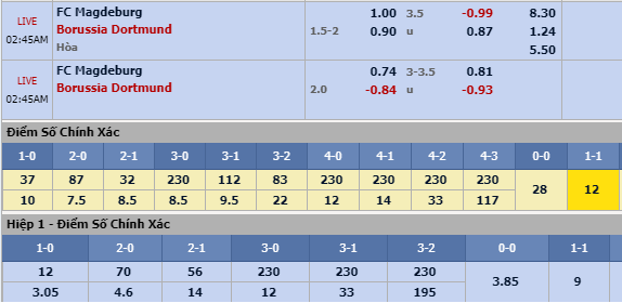 Hiệp 1: Trong 4 trận sân khách gần nhất đều chứng kiến Dortmund bất bại trong thời gian hiệp 1, trong đó có tới 3 lần họ tạo ra lợi thế dẫn bàn. Trong khi đó, Magdeburg ở trận gần nhất thậm chí đã bị dẫn trước tới 2 bàn ngay từ nửa đầu. Do đó, lựa chọn Dortmund -3/4 hiệp 1 là phương án hoàn toàn có cơ sở. Chọn Dortmund -3/4 hiệp 1.