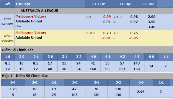 (Nhận định bóng đá) - Melbourne Victory có kèo chấp 1/2, thoạt nhìn tưởng chừng rất cao và mang chiều hướng tích cực. Bởi phía bên kia chiến tuyến là đối thủ có số má Adelaide Utd. Nhưng thực chất đó lại là chỉ số rất khiêm tốn và thậm chí còn có chiều hướng bất lợi cho đội chủ nhà. Tại sao lại có nghịch lý như vậy: so sánh với tỷ lệ châu Á ở những lần tiếp đón Adelaide Utd gần đây, Melbourne Victory đều chấp từ 1/2 trở lên. Cá biệt có trận đấu trên sân nhà hồi tháng 2 năm nay, Melbourne Victory thậm chí còn sắm vai cửa trên tới 1 1/4.