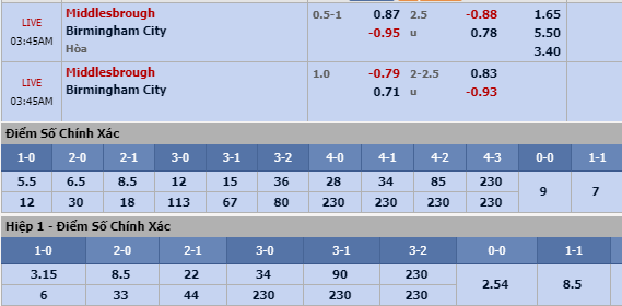Theo thống kê, 6 lần tiếp khách vừa qua, họ thắng 2, hòa 2, thua 2, trong đó chỉ một lần vượt qua rào cản handicap, đó là khúc khải hoàn trước đội cuối bảng Sunderland. Trong khi đó, Birmingham đang phát đi những tín hiệu tích cực về một sự hồi sinh mà chiến thắng 1-0 trước Nottingham ở vòng đấu trước là minh chứng. Thế nên, không bất ngờ nếu Boro bị cầm chân vào rạng sáng mai.