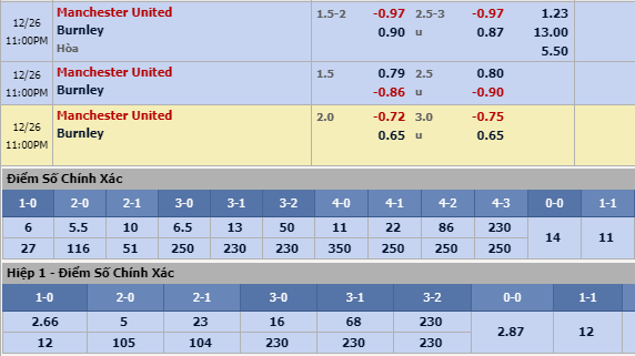 Hiệp 1: Mặc dù có lợi thế sân nhà, nhưng khả năng MU sớm chủ động đẩy tốc độ trận đấu lên cao ngay từ đầu khá thấp bởi họ sẽ dành nhiều thời gian tìm hiểu đối thủ và thận trọng nhằm tránh sai lầm đáng tiếc. Hơn nữa, khả năng chơi trong hiệp 1 của MU không được đánh giá cao khi họ chỉ 2/6 trận gần nhất có bàn dẫn trước. Ngược lại Burnley giữ sạch lưới 3/4 trận gần đây trong hiệp 1. Chọn Burnley +3/4 hiệp 1.