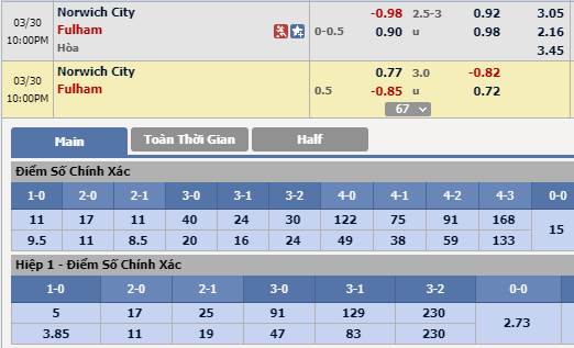 Tổng bàn thắng cả trận: Norwich không còn nhiều lý do để tính toán khi họ thiếu mục tiêu rõ ràng ở thời điểm hiện tại. Sự tập trung kín kẽ trong khâu phòng ngự vì thế đang bị nghi ngờ rất đáng kể. Bên phần sân đối diện, Fulham lại rất cần điểm để nuôi tham vọng thăng hạng trực tiếp nên trận đấu rất có thể sẽ diễn ra theo kịch bản tưng bừng bàn thắng. Chọn Trên 2 3/4 bàn cả trận.