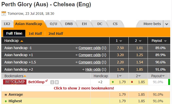 Dĩ nhiên, bất kể có ra sân với đội hình nào thì Chelsea vẫn được đánh giá cao hơn Perth Glory. Cho đến tối qua, TLCA chưa được niêm yết trên sàn, song dựa theo tỷ lệ châu Âu, đội bóng nước Anh dự kiến chấp chủ nhà 1 3/4 trái. Đây là mức chênh lệch cho thấy, The Blues trên cơ hoàn toàn so với đoàn quân của HLV Tony Popovic.