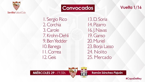 HLV Eduardo Berizzo của Sevilla đã lên danh sách 16 cầu thủ cho trận đấu này. Đội chủ sân Sanchez Pizjuan chỉ thiếu Vázquez và Lenglet so với đội hình ở trận gặp Villarreal tại La Liga cuối tuần qua. Như vậy, tất cả những ngôi sao tốt nhất mà Sevilla đang sở hữu như Nolito, Navas, Pizarro, Banega, Muriel hay Ben Yedder đều có tên cho trận đấu vào đêm nay.