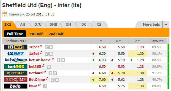 Đa phần các nhà cái châu Âu đều niêm yết mức ăn cho Inter rất thấp (dao động trong khoảng 1.28-1.30) và ngược lại, nếu NHM nằm Sheffield Utd sẽ ăn ở mức trên dưới 6.50. Với TL châu Âu như vậy thì handicap sẽ rơi vào tầm Inter chấp 1 1/4. Đây là mức phù hợp với tương quan giữa 2 đội lúc này: Sheffield Utd có ưu thế sân nhà nhưng các vị khách lại nhỉnh hơn về thực lực. Với TL như vậy thì cửa trên không phải là lựa chọn sáng giá, nhất là khi ông Spalletti vẫn đang trong quá trình thử nghiệm cầu thủ và chiến thuật.