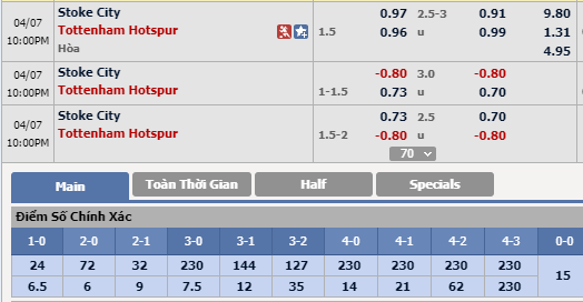 Tổng bàn thắng cả trận: Tottenham thường rất dễ chơi khi gặp Stoke. Bằng chứng dễ thấy nhất là liên tiếp 5 trận đối đầu gần nhất đội bóng thành London đều ghi được ít nhất 2 bàn, trong đó có 4 lần ghi tối thiểu 4 bàn thắng. Thực tế, cả 7 trận đối đầu gần nhất giữa 2 đội đều khép lại với tối thiểu 3 bàn thắng cũng là gợi ý không tồi cho lựa chọn tưng bừng. Chọn Trên 2 3/4 bàn cả trận.